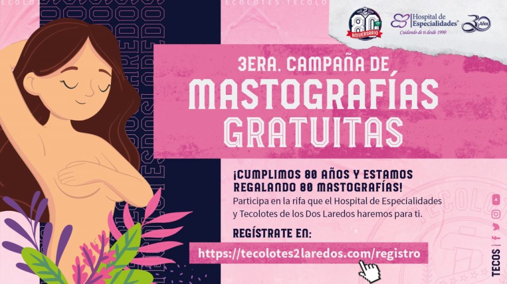 Conmemorando el Día Internacional de la Lucha contra el Cáncer de Mama, ambas instituciones estarán sorteando el próximo sábado 24 de octubre 80 estudios entre quienes se inscriban al sitio https://www.tecos2laredos.com/registro. Hombres y mujeres a partir de los 40 años pueden realizar su inscripción a dicha rifa.
